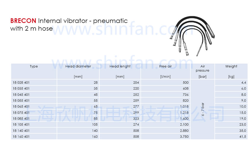 BRECON pneumatic internal vibrators are available in 28, 35, 45, 55, 65, 75, 85, 105, 140 and 160mm diameter.