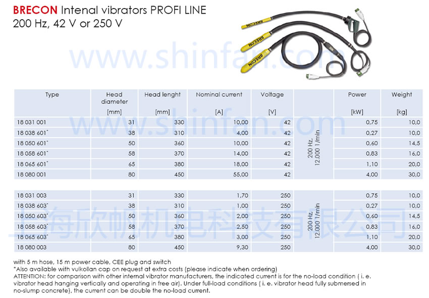 BRECON internal vibrators for frequency inverters are available in 31, 38, 50, 58, and 65mm diameter for 230V or 110V single-phase input.